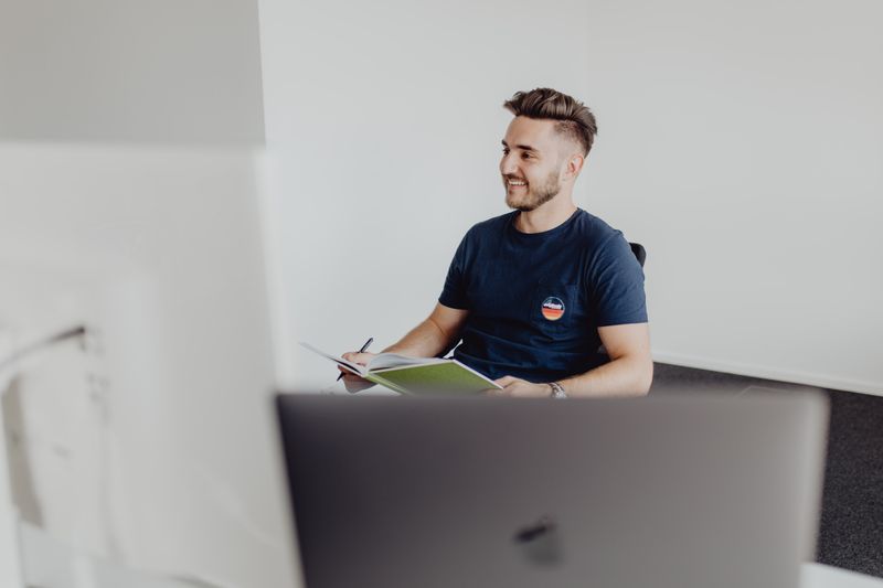 Täglich beschützt Benji unser Büro vor gefährlichen Eindringlingen wie Postboten und Lieferando-Lieferanten. Zusätzlich unterstützt er das Team mit seinem unwiderstehlich charmanten Hundeblick auch bei der ein oder anderen Kundenakquise.